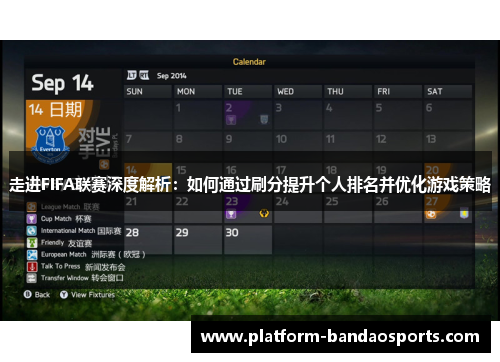 本文将对FIFA联赛的机制进行深度解析,重点探讨如何通过刷分提升个人排名,并结合具体策略优化游戏表现。在这篇文章中,我们将从多个角度来解析如何在FIFA联赛中取得更高排名,包括刷分的技巧、如何根据游戏机制调整策略、如何提高个人技术水平以及如何利用社区和社交互动来增强自身的竞争力。通过这四个方面的详细阐述,读者将能掌握提升个人排名的核心方法,并学会如何优化游戏策略。